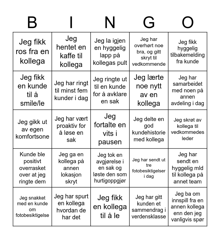This bingo card has 25 words: Jeg ga en kollega på annen lokasjon skryt, Jeg fikk en kollega til å le, Jeg ringte ut til en kunde for å avklare en sak, Jeg snakket med en kunde om fotobesiktigelse, Jeg fikk hyggelig tilbakemelding fra kunde, Jeg fikk ros fra en kollega, Jeg fikk en kunde til å smile/le, Jeg hentet en kaffe til kollega, Jeg delte en god kundehistorie med kollega, Jeg tok en avgjørelse i en sak og løste den som hurtigoppgjør, Jeg lærte noe nytt av en kollega, Jeg gikk ut av egen komfortsone, Jeg har sendt ut tre fotobesiktigelser i dag, Jeg har sendt en hyggelig mld til kollega på annet team, Jeg har ringt til minst fem kunder i dag, Jeg ba om innspill fra en annen kollega enn den jeg vanligvis spør, Jeg skrøt av kollega til vedkommedes leder, Jeg la igjen en hyggelig lapp på kollegas pult, Jeg har samarbeidet med noen på annen avdeling i dag, Jeg har vært proaktiv for å løse en sak, Jeg fortalte en vits i pausen, Jeg har spurt en kollega hvordan de har det, Kunde ble positivt overrasket over at jeg ringte dem, Jeg har overhørt noe bra, og gitt skryt til vedkommende and Jeg har gitt kunden et sammendrag i verdensklasse.