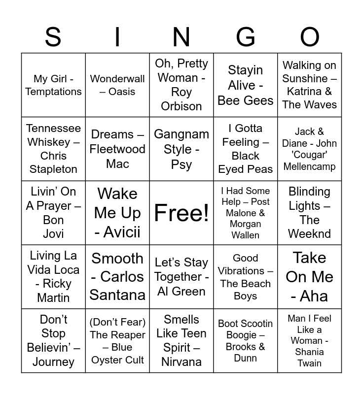 This bingo card has a free space and 70 words: Confessions Part II – Usher, Blinding Lights – The Weeknd, Happy – Pharrell Williams, Friends in Low Places - Garth Brooks, (Don’t Fear) The Reaper – Blue Oyster Cult, Beat It – Michael Jackson, Stayin Alive - Bee Gees, A Bar Song (Tipsy) – Shaboozey, Walking on Sunshine – Katrina & The Waves, In the Air Tonight - Phil Collins, Take On Me - Aha, Tiny Dancer - Elton John, My Girl - Temptations, Oh, Pretty Woman - Roy Orbison, Lose Yourself – Eminem, Wake Me Up - Avicii, Let’s Stay Together - Al Green, I Gotta Feeling – Black Eyed Peas, Havana - Camila Cabello, Living La Vida Loca - Ricky Martin, I Had Some Help – Post Malone & Morgan Wallen, Good Vibrations – The Beach Boys, Jack & Diane - John 'Cougar' Mellencamp, Dancing Queen – ABBA, Houdini - Dua Lipa, Hey Ya! – Outkast, Bye Bye Bye – NSYNC, My Universe – Coldplay, BTS, Boot Scootin Boogie – Brooks & Dunn, Here Comes the Sun – The Beatles, Wonderwall – Oasis, Hello – Adele, My Best Friend’s Girl – The Cars, Pink Pony Club – Chappell Roan, Kings & Queens - Ava Max, Amarillo By Morning – George Strait, I Won't Back Down - Tom Petty, Iris - Goo Goo Dolls, Fortunate Son - Creedence Clearwater Revival, Tennessee Whiskey – Chris Stapleton, Uptown Funk – Bruno Mars, Smooth - Carlos Santana, Man I Feel Like a Woman - Shania Twain, Watermelon Sugar – Harry Styles, Heart of Glass - Blondie, Dreams – Fleetwood Mac, Don’t Stop Believin’ – Journey, (Don't You) Forget About Me - Simple Minds, I Ain’t Worried – OneRepublic, September - Earth Wind and Fire, Bad Guy - Billie Eilish, Anti-Hero – Taylor Swift, Gangsta's Paradise - Coolio, No Scrubs – TLC, Smells Like Teen Spirit – Nirvana, Old Town Road - Lil Nas X, Gangnam Style - Psy, Espresso - Sabrina Carpenter, With a Little Help From My Friends - Joe Cocker, Light My Fire – The Doors, Livin’ On A Prayer – Bon Jovi, Baby One More Time - Britney Spears, My Sharona - The Knack, Bust a Move - Young MC, House of the Rising Sun - The Animals, Gimme Shelter – Rolling Stones, Cheap Thrills - Sia, Mr. Brightside – The Killers, Texas Hold ‘Em – Beyonce and Shape of You - Ed Sheeran.