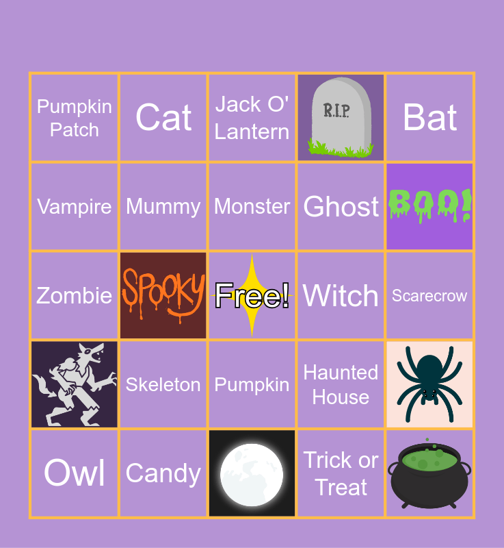 This bingo card has 7 images, a free space and 17 words: Skeleton, Candy, Monster, Owl, Bat, Pumpkin Patch, Vampire, Cat, Witch, Pumpkin, Ghost, Zombie, Haunted House, Mummy, Trick or Treat, Scarecrow and Jack O' Lantern.