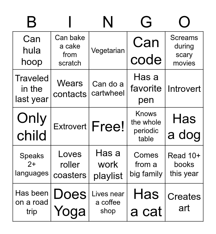 This bingo card has a free space and 24 words: Loves roller coasters, Does Yoga, Can do a cartwheel, Has been on a road trip, Screams during scary movies, Can hula hoop, Traveled in the last year, Can bake a cake from scratch, Knows the whole periodic table, Has a work playlist, Has a favorite pen, Only child, Comes from a big family, Read 10+ books this year, Wears contacts, Has a cat, Has a dog, Vegetarian, Introvert, Extrovert, Creates art, Speaks 2+ languages, Can code and Lives near a coffee shop.