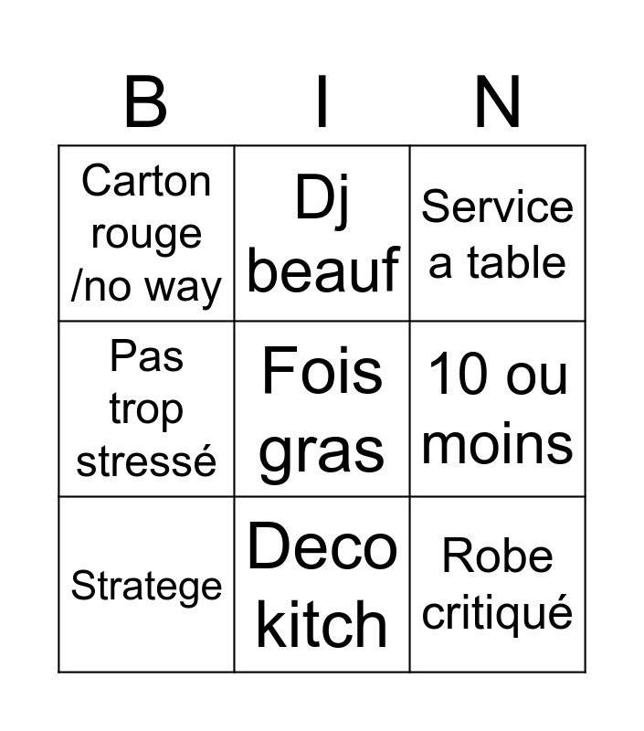 This bingo card has a free space and 10 words: Deco kitch, Service a table, Carton rouge /no way, Robe critiqué, Pas trop stressé, Stratege, Dj beauf, Danse beauf, 10 ou moins and Preshot.