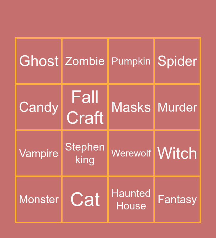 This bingo card has 16 words: Cat, Witch, Pumpkin, Ghost, Vampire, Zombie, Werewolf, Haunted House, Candy, Fall Craft, Monster, Spider, Stephen king, Murder, Masks and Fantasy.
