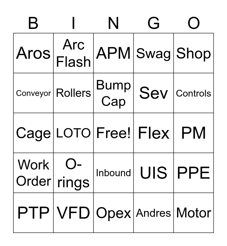 This bingo card has a free space and 29 words: PTP, Safety, LOTO, Mobats, Aros, APM, Rollers, O-rings, Flex, VFD, PM, Motor, Opex, Andres, Controls, Outbound, Inbound, Work Order, Shop, Cage, UIS, Drop a Ticket, Sev, Conveyor, Swag, Arc Flash, PPE, Bump Cap and Shawn.