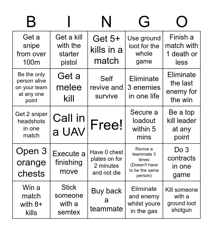 This bingo card has a free space and 29 words: Buy back a teammate, Stick someone with a semtex, Get 5+ kills in a match, Eliminate an enemy whilst their in the air, Finish a match with 1 death or less, Get a snipe from over 100m, Get a melee kill, Self revive and survive, Secure a loadout within 5 mins, Do 3 contracts in one game, Win a match with 8+ kills, Call in a UAV, Eliminate and enemy whilst youre in the gas, Kill someone with a ground loot shotgun, Get 2 sniper headshots in one match, Survive 2 circles without dying, Buy back a teammate, Revive a teammate 3 times (Doesn't have to be the same person), Eliminate the last enemy for the win, Open 3 orange chests, Execute a finishing move, Throw a snapshot and get a kill from it, Eliminate 3 enemies in one life, Be a top kill leader at any point, Be the only person alive on your team at any one point, Get a kill with the starter pistol, Have 0 chest plates on for 2 minutes and not die, Use ground loot for the whole game and Land at control.