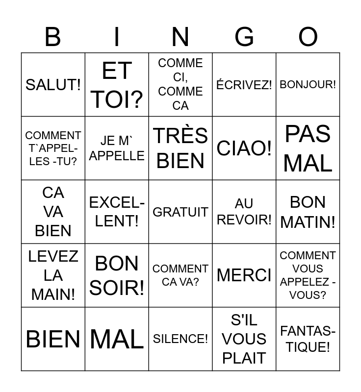 This bingo card has a free space and 24 words: BON SOIR!, MAL, TRÈS BIEN, BIEN, BONJOUR!, SALUT!, COMMENT T`APPEL- LES -TU?, ET TOI?, AU REVOIR!, COMMENT CA VA?, CIAO!, CA VA BIEN, MERCI, COMMENT VOUS APPELEZ -VOUS?, JE M` APPELLE, S'IL VOUS PLAIT, BON MATIN!, COMME CI, COMME CA, PAS MAL, EXCEL-LENT!, FANTAS-TIQUE!, LEVEZ LA MAIN!, ÉCRIVEZ! and SILENCE!.