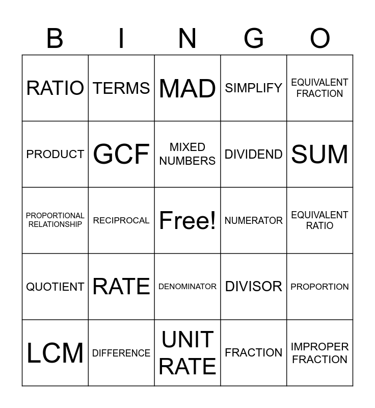 This bingo card has a free space and 24 words: RATE, DIFFERENCE, MIXED NUMBERS, LCM, EQUIVALENT FRACTION, RATIO, PRODUCT, TERMS, NUMERATOR, DENOMINATOR, DIVIDEND, PROPORTIONAL RELATIONSHIP, DIVISOR, PROPORTION, GCF, FRACTION, EQUIVALENT RATIO, MAD, SUM, RECIPROCAL, IMPROPER FRACTION, QUOTIENT, SIMPLIFY and UNIT RATE.