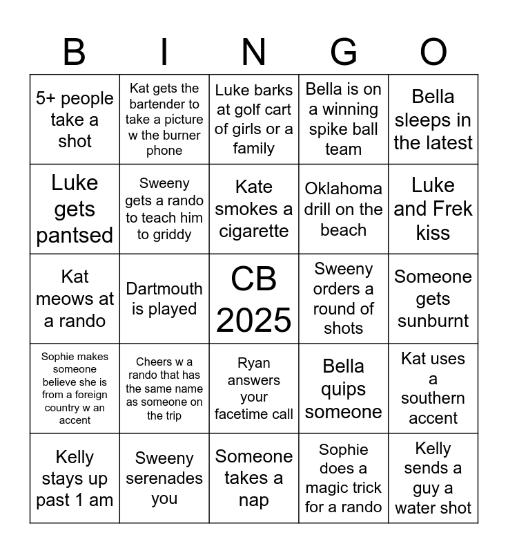 This bingo card has a free space and 34 words: Frek gets hit, Sophie does a magic trick for a rando, Kate does not throw up, Luke refers to the bartender as daddy when ordering a drink, Sophie makes someone believe she is from a foreign country w an accent, Sweeny gets a rando to teach him to griddy, Bella sleeps in the latest, Kelly stays up past 1 am, Kat gets the bartender to take a picture w the burner phone, Frek does the thug shaker at the bar, Kate smokes a cigarette, Luke barks at golf cart of girls or a family, 5+ people shot gun, Someone rides a ride on the boardwalk, Sweeny orders a round of shots, Luke and Frek kiss, Sweeny serenades you, Kat meows at a rando, Cheers w a rando that has the same name as someone on the trip, Bella quips someone, Ryan answers your facetime call, Pee outside, 5+ people take a shot, Someone gets sunburnt, Someone takes a nap, Kelly sends a guy a water shot, Bella is on a winning spike ball team, Sophie makes a tiktok, Oklahoma drill on the beach, Luke gets pantsed, Sweeny and Sylvie have a moment, Dartmouth is played, Kat uses a southern accent and Rando says “is that a flip phone”.