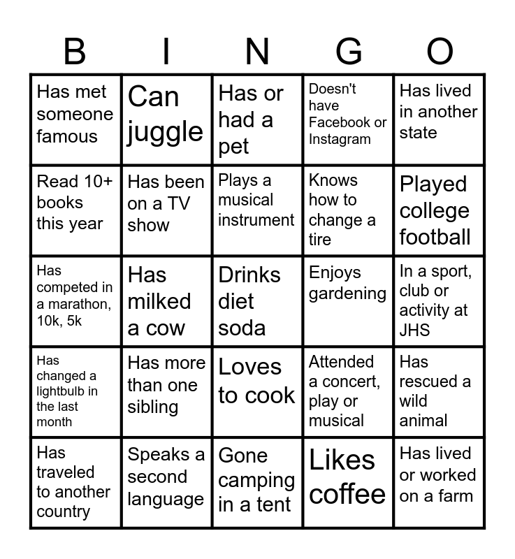 This bingo card has a free space and 24 words: Has more than one sibling, Speaks a second language, Plays a musical instrument, Has traveled to another country, Has lived in another state, Has met someone famous, Read 10+ books this year, Can juggle, Enjoys gardening, Loves to cook, Knows how to change a tire, Has competed in a marathon, 10k, 5k, Attended a concert, play or musical, Has rescued a wild animal, Has been on a TV show, Likes coffee, In a sport, club or activity at JHS, Has or had a pet, Played college football, Has milked a cow, Has lived or worked on a farm, Has changed a lightbulb in the last month, Doesn't have Facebook or Instagram and Gone camping in a tent.
