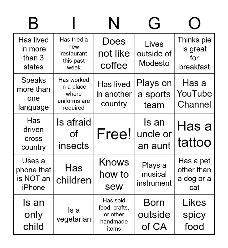 This bingo card has a free space and 24 words: Has children, Is a vegetarian, Has lived in another country, Is an only child, Thinks pie is great for breakfast, Has lived in more than 3 states, Speaks more than one language, Has tried a new restaurant this past week, Is an uncle or an aunt, Knows how to sew, Plays on a sports team, Has driven cross country, Plays a musical instrument, Has a pet other than a dog or a cat, Has worked in a place where uniforms are required, Born outside of CA, Has a tattoo, Does not like coffee, Has a YouTube Channel, Is afraid of insects, Likes spicy food, Uses a phone that is NOT an iPhone, Lives outside of Modesto and Has sold food, crafts, or other handmade items.