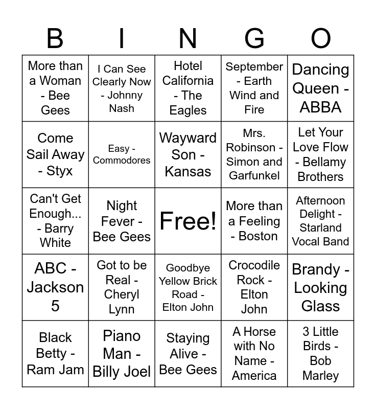 This bingo card has a free space and 43 words: Alone Again - Gilbert O'Sullivan, 3 Little Birds - Bob Marley, Take a Chance - ABBA, Black Betty - Ram Jam, Wild World - Cat Stevens, A Horse with No Name - America, Hotel California - The Eagles, Take Me Home - John Denver, Dancing Queen - ABBA, Piano Man - Billy Joel, September - Earth Wind and Fire, More than a Feeling - Boston, Goodbye Yellow Brick Road - Elton John, Got to be Real - Cheryl Lynn, Come and Get Your Love - Redbone, Staying Alive - Bee Gees, Maggie Mae - Rod Stewart, Can't Get Enough... - Barry White, The Reaper - Blue Oyster Cult, Let Your Love Flow - Bellamy Brothers, I Can See Clearly Now - Johnny Nash, Hot Stuff - Donna Summers, Another Brick in the Wall - Pink Floyd, More than a Woman - Bee Gees, Jolene - Dolly Parton, Afternoon Delight - Starland Vocal Band, Do Ya Think I'm Sexy - Rod Stewart, Miss You - Rolling Stones, Crocodile Rock - Elton John, ABC - Jackson 5, Take it Easy - Eagles, Brandy - Looking Glass, Mr Blue Sky - ELO, Night Fever - Bee Gees, Sweet Home Alabama - Lynyrd Skynyrd, You're So Vain - Carly Simon, Dream On - Aerosmith, Wayward Son - Kansas, Come Sail Away - Styx, Mrs. Robinson - Simon and Garfunkel, Mamma Mia - ABBA, Easy - Commodores and My Sharona - The Knack.