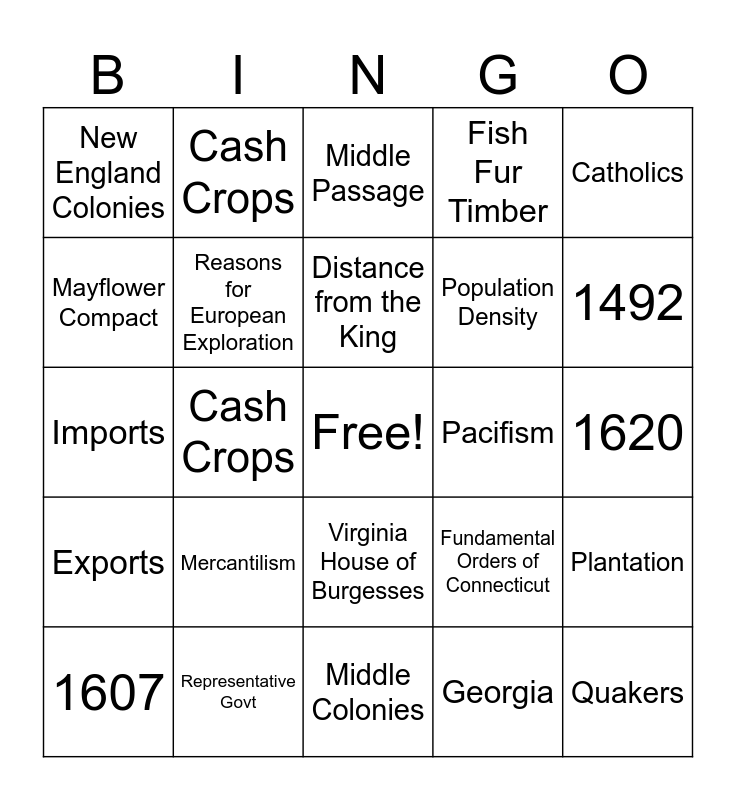 This bingo card has a free space and 29 words: 1607, Pilgrims, Cash Crops, Puritans, New England Colonies, Middle Passage, Reasons for European Exploration, Mercantilism, Pacifism, Representative Govt, 1620, Quakers, Middle Colonies, Georgia, 1492, Southern Colonies, Virginia House of Burgesses, Exports, Catholics, Imports, Fundamental Orders of Connecticut, Triangular Trade, Population Density, Mayflower Compact, Fish Fur Timber, Cash Crops, Plantation, Distance from the King and Charter.