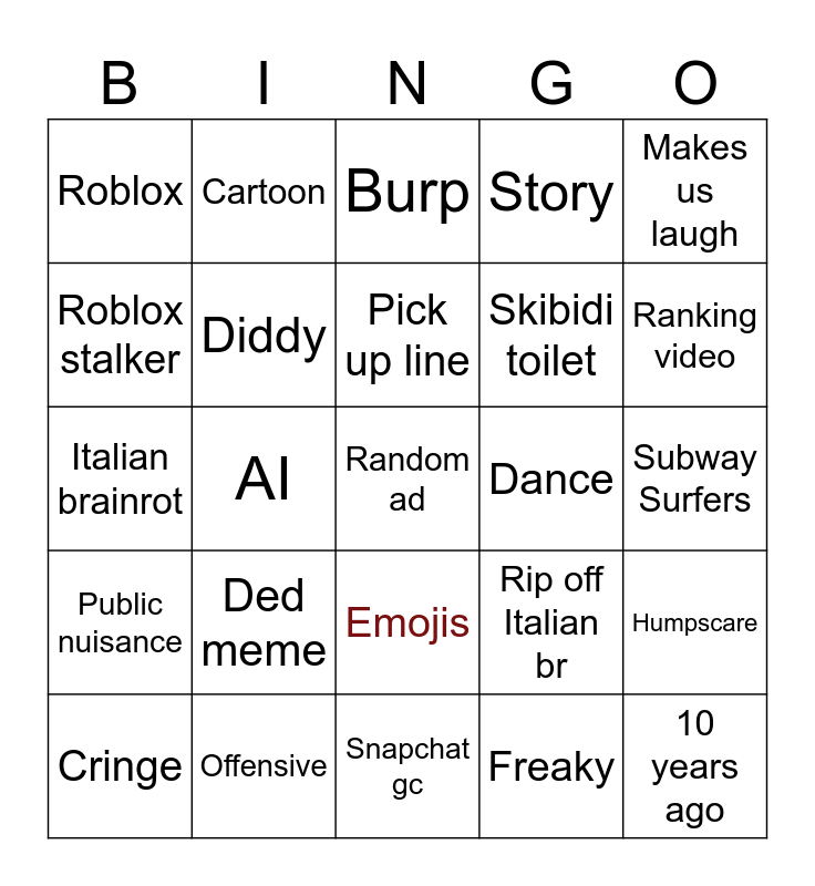 This bingo card has a free space and 24 words: Ded meme, Offensive, Pick up line, Cringe, Makes us laugh, Roblox, Roblox stalker, Cartoon, Dance, Emojis, Skibidi toilet, Italian brainrot, Rip off Italian br, Humpscare, Diddy, Freaky, Subway Surfers, Burp, Ranking video, AI, 10 years ago, Public nuisance, Story and Snapchat gc.