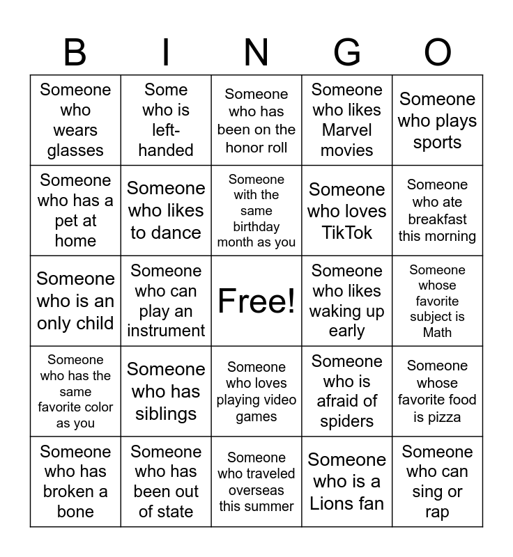 This bingo card has a free space and 24 words: Someone who has siblings, Someone who has been out of state, Someone with the same birthday month as you, Someone who has broken a bone, Someone who plays sports, Someone who wears glasses, Someone who has a pet at home, Some who is left-handed, Someone who likes waking up early, Someone who loves playing video games, Someone who loves TikTok, Someone who is an only child, Someone who is afraid of spiders, Someone whose favorite food is pizza, Someone who likes to dance, Someone who is a Lions fan, Someone whose favorite subject is Math, Someone who has been on the honor roll, Someone who ate breakfast this morning, Someone who can play an instrument, Someone who can sing or rap, Someone who has the same favorite color as you, Someone who likes Marvel movies and Someone who traveled overseas this summer.