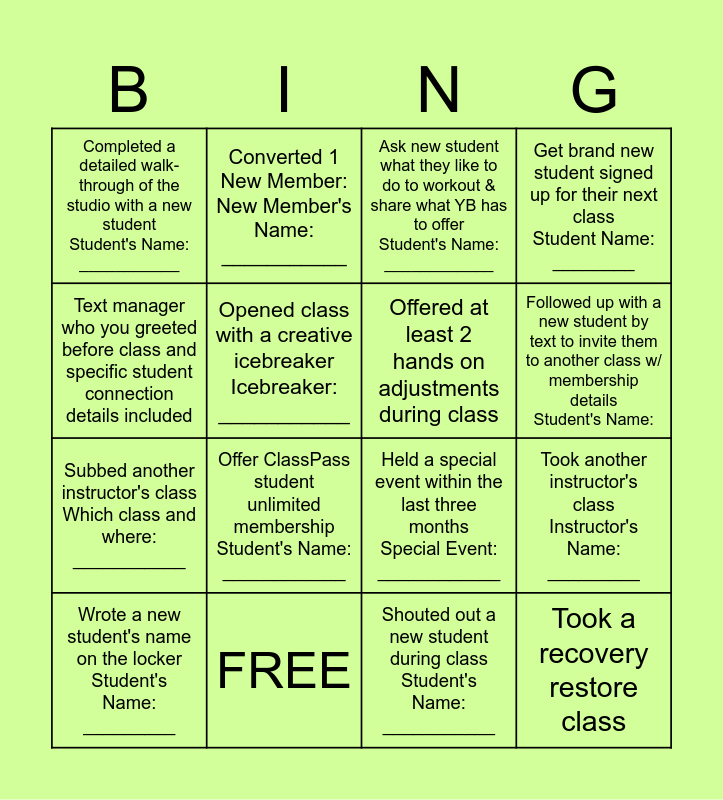 This bingo card has 16 words: Wrote a new student's name on the locker Student's Name: _________, FREE, Ask new student what they like to do to workout & share what YB has to offer Student's Name: ____________, Get brand new student signed up for their next class Student Name: ________, Text manager who you greeted before class and specific student connection details included, Converted 1 New Member: New Member's Name: ___________, Held a special event within the last three months Special Event: ____________, Took another instructor's class Instructor's Name: _________, Completed a detailed walk-through of the studio with a new student Student's Name: ___________, Opened class with a creative icebreaker Icebreaker: ___________, Shouted out a new student during class Student's Name: ___________, Followed up with a new student by text to invite them to another class w/ membership details Student's Name:, Subbed another instructor's class Which class and where: ___________, Offer ClassPass student unlimited membership Student's Name: ____________, Offered at least 2 hands on adjustments during class and Took a recovery restore class.