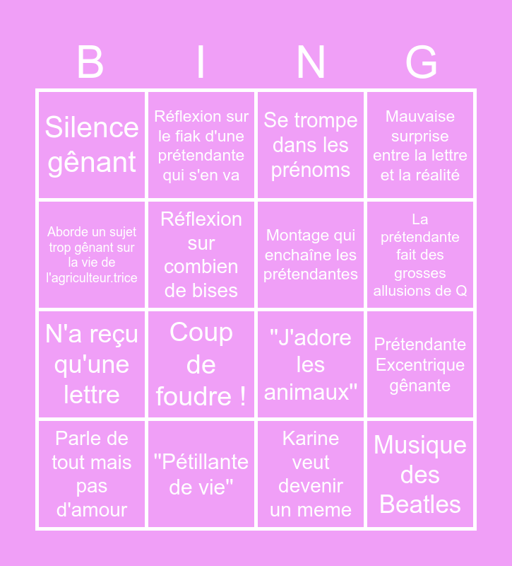 This bingo card has 16 words: ''Pétillante de vie'', Prétendante Excentrique gênante, Se trompe dans les prénoms, Silence gênant, N'a reçu qu'une lettre, Réflexion sur le fiak d'une prétendante qui s'en va, ''J'adore les animaux'', Karine veut devenir un meme, Aborde un sujet trop gênant sur la vie de l'agriculteur.trice, Réflexion sur combien de bises, Parle de tout mais pas d'amour, Mauvaise surprise entre la lettre et la réalité, Coup de foudre !, La prétendante fait des grosses allusions de Q, Montage qui enchaîne les prétendantes and Musique des Beatles.