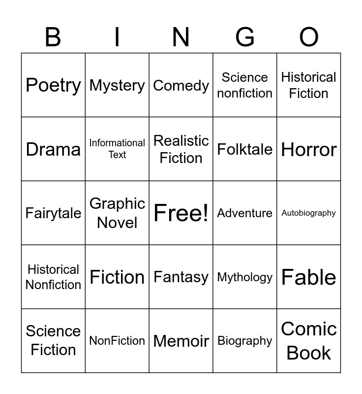 This bingo card has a free space and 24 words: Fiction, NonFiction, Realistic Fiction, Science Fiction, Historical Fiction, Poetry, Drama, Mystery, Adventure, Fantasy, Folktale, Fairytale, Mythology, Fable, Informational Text, Biography, Autobiography, Comedy, Horror, Graphic Novel, Comic Book, Historical Nonfiction, Science nonfiction and Memoir.
