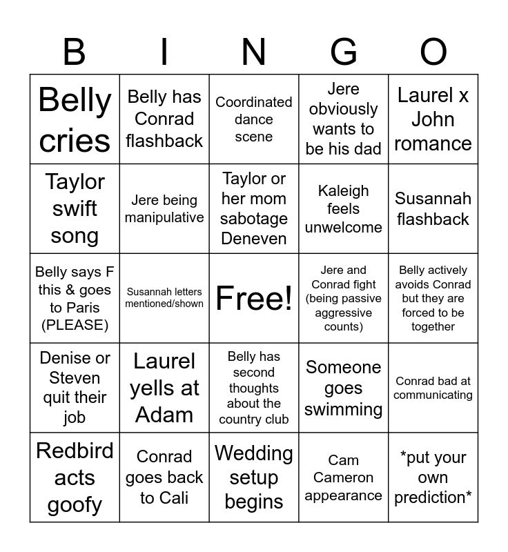 This bingo card has a free space and 24 words: Laurel yells at Adam, Conrad goes back to Cali, Taylor or her mom sabotage Deneven, Redbird acts goofy, Laurel x John romance, Belly cries, Taylor swift song, Belly has Conrad flashback, Jere and Conrad fight (being passive aggressive counts), Belly has second thoughts about the country club, Kaleigh feels unwelcome, Belly says F this & goes to Paris (PLEASE), Someone goes swimming, Conrad bad at communicating, Jere being manipulative, Cam Cameron appearance, Belly actively avoids Conrad but they are forced to be together, Coordinated dance scene, Susannah flashback, Susannah letters mentioned/shown, *put your own prediction*, Denise or Steven quit their job, Jere obviously wants to be his dad and Wedding setup begins.