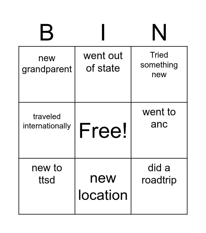 This bingo card has a free space and 9 words: new to ttsd, Tried something new, went out of state, traveled internationally, new grandparent, went to anc, did a roadtrip, went camping and new location.
