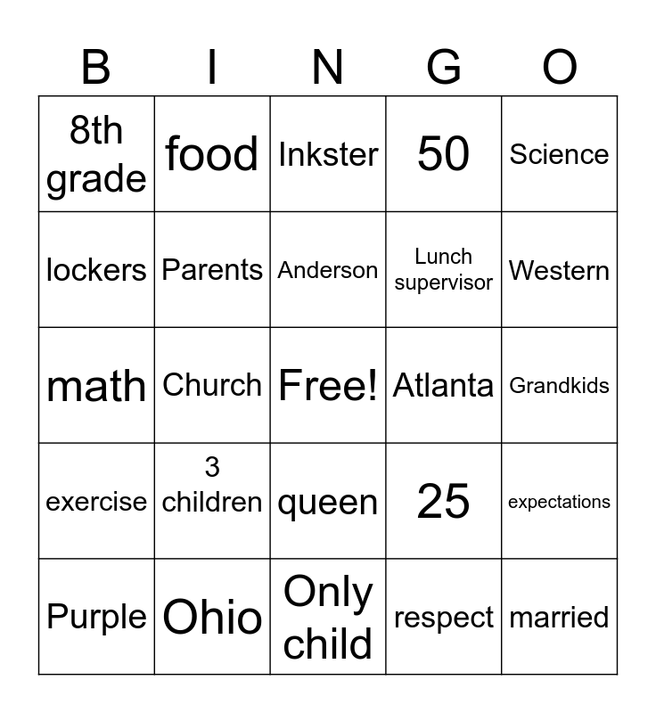 This bingo card has a free space and 24 words: 3 children, Ohio, Anderson, Purple, Science, 8th grade, lockers, food, Atlanta, queen, Lunch supervisor, math, 25, expectations, Parents, respect, Grandkids, Inkster, Western, Church, married, exercise, 50 and Only child.
