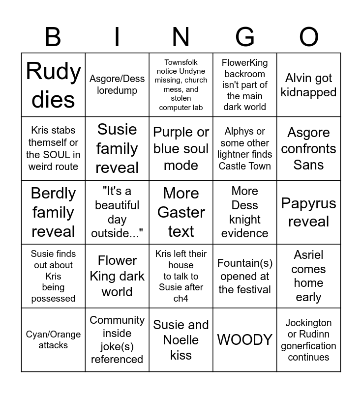 This bingo card has a free space and 24 words: Flower King dark world, Community inside joke(s) referenced, Purple or blue soul mode, Cyan/Orange attacks, Alvin got kidnapped, Rudy dies, Kris stabs themself or the SOUL in weird route, Asgore/Dess loredump, More Dess knight evidence, Kris left their house to talk to Susie after ch4, Alphys or some other lightner finds Castle Town, Berdly family reveal, Fountain(s) opened at the festival, Asriel comes home early, Susie family reveal, WOODY, Papyrus reveal, Townsfolk notice Undyne missing, church mess, and stolen computer lab, Asgore confronts Sans, "It's a beautiful day outside...", Jockington or Rudinn gonerfication continues, Susie finds out about Kris being possessed, FlowerKing backroom isn't part of the main dark world and Susie and Noelle kiss.