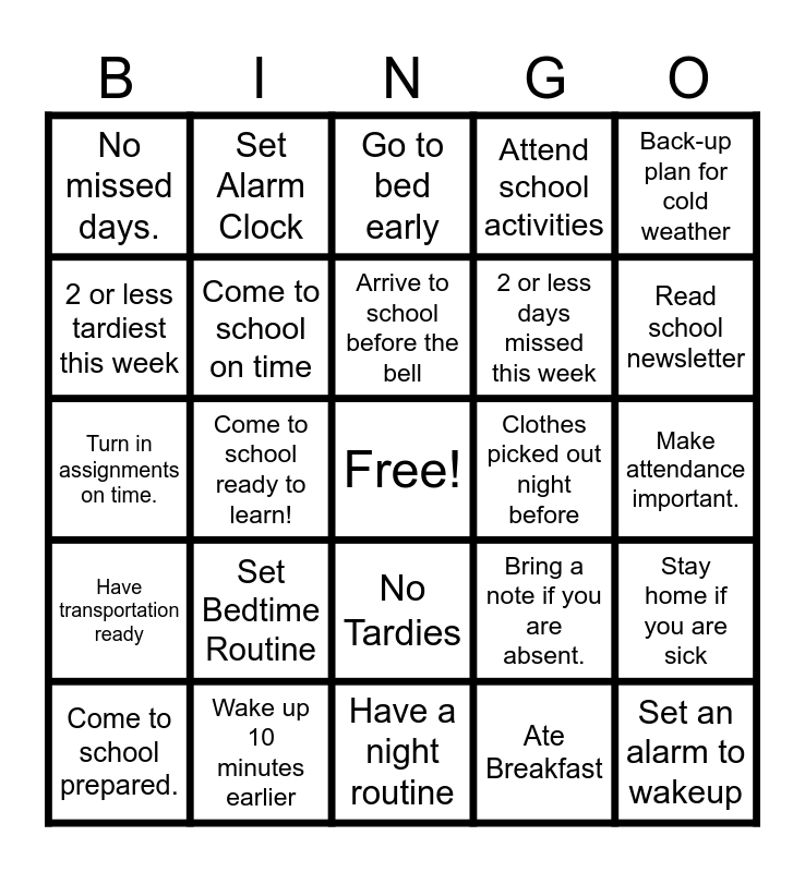 This bingo card has a free space and 24 words: Come to school prepared., Set Bedtime Routine, Arrive to school before the bell, Ate Breakfast, Back-up plan for cold weather, No missed days., Set Alarm Clock, Go to bed early, Clothes picked out night before, Make attendance important., Turn in assignments on time., Come to school on time, Bring a note if you are absent., Stay home if you are sick, 2 or less tardiest this week, Wake up 10 minutes earlier, Have a night routine, Attend school activities, Read school newsletter, Have transportation ready, Come to school ready to learn!, No Tardies, 2 or less days missed this week and Set an alarm to wakeup.