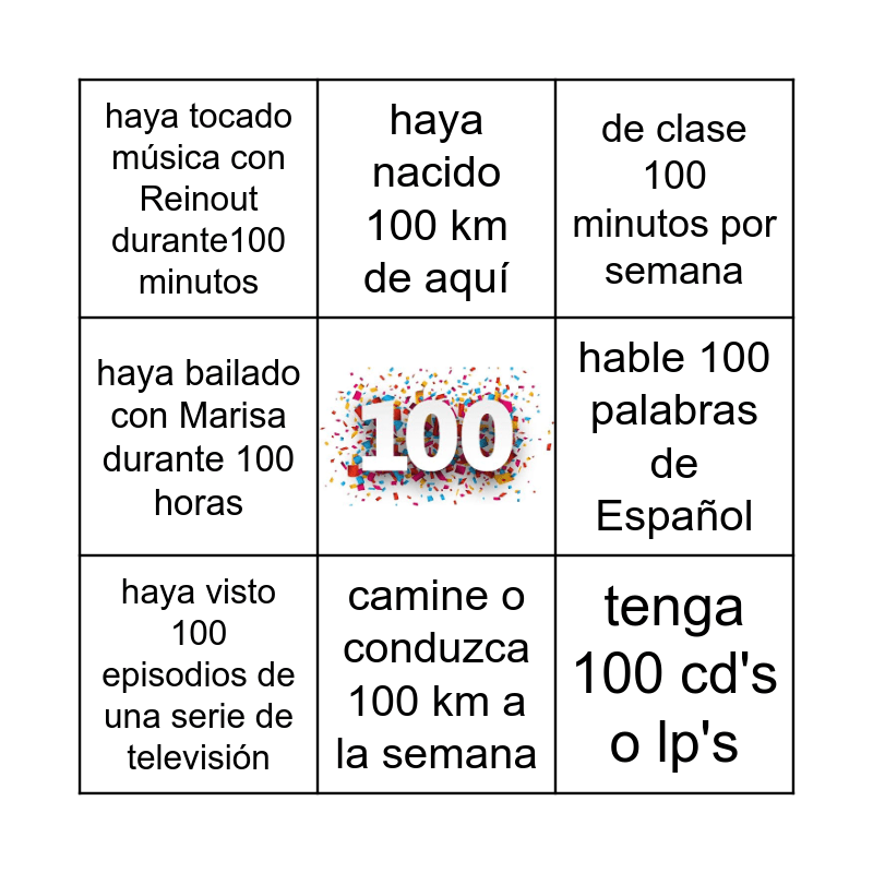 This bingo card has a free space and 8 words: hable 100 palabras de Español, de clase 100 minutos por semana, haya nacido 100 km de aquí, haya visto 100 episodios de una serie de televisión, haya tocado música con Reinout durante100 minutos, tenga 100 cd's o lp's, haya bailado con Marisa durante 100 horas and camine o conduzca 100 km a la semana.