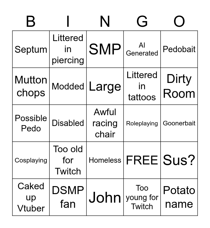 This bingo card has 25 words: Too old for Twitch, John, Large, Caked up Vtuber, Pedobait, Septum, Mutton chops, Littered in piercing, Roleplaying, Homeless, Littered in tattoos, Possible Pedo, FREE, Sus?, Modded, Potato name, Goonerbait, SMP, Dirty Room, Disabled, Awful racing chair, DSMP fan, Cosplaying, AI Generated and Too young for Twitch.