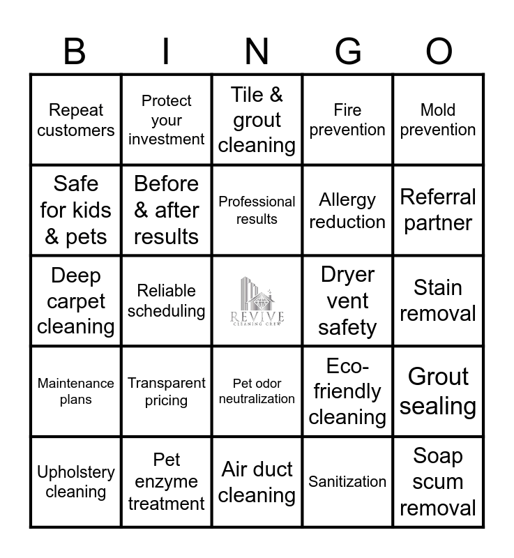 This bingo card has a free space and 25 words: Transparent pricing, Air duct cleaning, Professional results, Upholstery cleaning, Mold prevention, Repeat customers, Safe for kids & pets, Protect your investment, Dryer vent safety, Pet odor neutralization, Allergy reduction, Deep carpet cleaning, Eco-friendly cleaning, Grout sealing, Before & after results, High traffic areas, Stain removal, Tile & grout cleaning, Referral partner, Reliable scheduling, Soap scum removal, Pet enzyme treatment, Maintenance plans, Fire prevention and Sanitization.