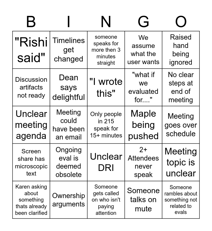 This bingo card has a free space and 24 words: Ongoing eval is deemed obsolete, Ownership arguments, "I wrote this", Karen asking about something thats already been clarified, Raised hand being ignored, "Rishi said", Discussion artifacts not ready, Timelines get changed, Maple being pushed, Unclear DRI, "what if we evaluated for....", Unclear meeting agenda, 2+ Attendees never speak, Meeting topic is unclear, Dean says delightful, Someone talks on mute, Meeting goes over schedule, someone speaks for more then 3 minutes straight, No clear steps at end of meeting, Meeting could have been an email, Someone rambles about something not related to evals, Screen share has microscopic text, We assume what the user wants and Someone gets called on who isn't paying attention.