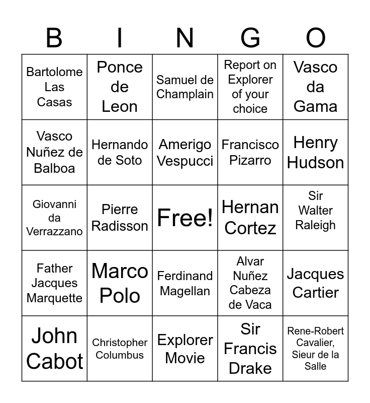 This bingo card has a free space and 24 words: Marco Polo, Christopher Columbus, Amerigo Vespucci, John Cabot, Vasco da Gama, Bartolome Las Casas, Vasco Nuñez de Balboa, Ponce de Leon, Hernan Cortez, Ferdinand Magellan, Francisco Pizarro, Giovanni da Verrazzano, Alvar Nuñez Cabeza de Vaca, Jacques Cartier, Hernando de Soto, Sir Francis Drake, Sir Walter Raleigh, Samuel de Champlain, Henry Hudson, Pierre Radisson, Rene-Robert Cavalier, Sieur de la Salle, Father Jacques Marquette, Report on Explorer of your choice and Explorer Movie.