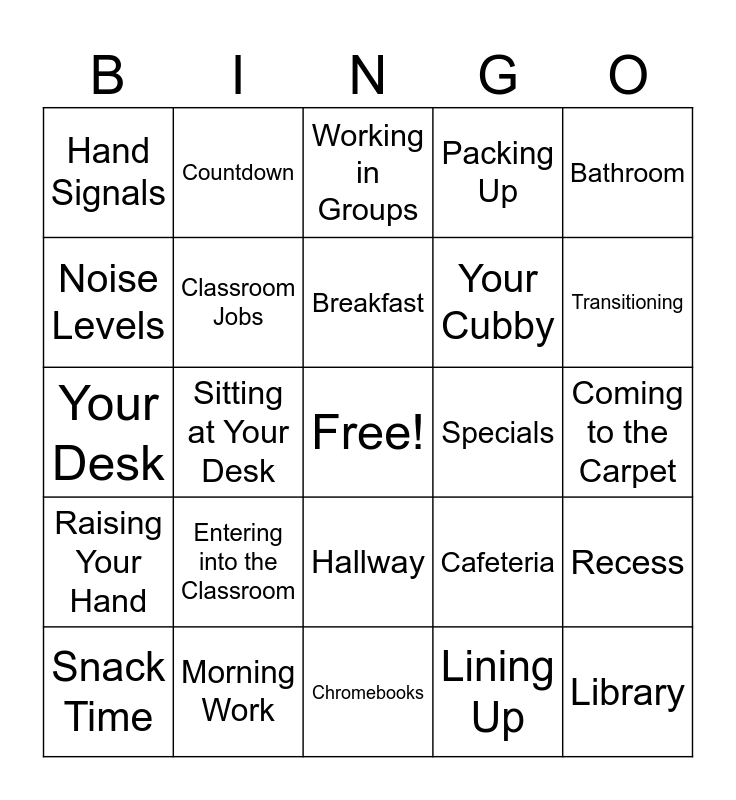 This bingo card has a free space and 24 words: Entering into the Classroom, Morning Work, Breakfast, Snack Time, Bathroom, Hand Signals, Noise Levels, Countdown, Specials, Hallway, Your Cubby, Your Desk, Cafeteria, Recess, Classroom Jobs, Lining Up, Coming to the Carpet, Working in Groups, Transitioning, Sitting at Your Desk, Library, Raising Your Hand, Packing Up and Chromebooks.