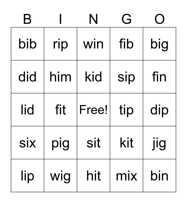 This bingo card has a free space and 24 words: pig, wig, kid, lip, big, bib, did, rip, tip, sit, sip, lid, kit, jig, him, mix, dip, win, fin, fit, bin, six, fib and hit.