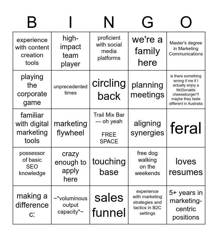 This bingo card has a free space and 24 words: crazy enough to apply here, ~*voluminous output capacity*~, circling back, making a difference c:, Master's degree in Marketing Communications, experience with content creation tools, playing the corporate game, high-impact team player, aligning synergies, touching base, planning meetings, familiar with digital marketing tools, free dog walking on the weekends, loves resumes, unprecedented times, experience with marketing strategies and tactics in B2C settings, feral, proficient with social media platforms, is there something wrong if me if I actually enjoy a McDonalds cheeseburger?! maybe they taste different in Australia, marketing flywheel, 5+ years in marketing-centric positions, possessor of basic SEO knowledge, we're a family here and sales funnel.