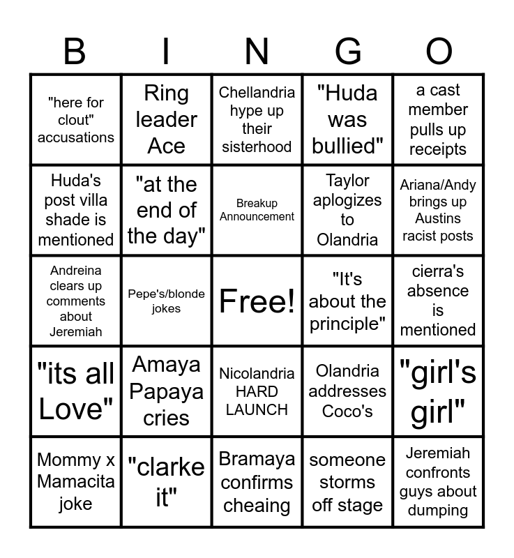 This bingo card has a free space and 24 words: Amaya Papaya cries, "clarke it", Breakup Announcement, Mommy x Mamacita joke, a cast member pulls up receipts, "here for clout" accusations, Huda's post villa shade is mentioned, Ring leader Ace, "It's about the principle", Nicolandria HARD LAUNCH, Taylor aplogizes to Olandria, Andreina clears up comments about Jeremiah, Olandria addresses Coco's, "girl's girl", "at the end of the day", someone storms off stage, cierra's absence is mentioned, Chellandria hype up their sisterhood, Ariana/Andy brings up Austins racist posts, Pepe's/blonde jokes, Jeremiah confronts guys about dumping, "its all Love", "Huda was bullied" and Bramaya confirms cheaing.