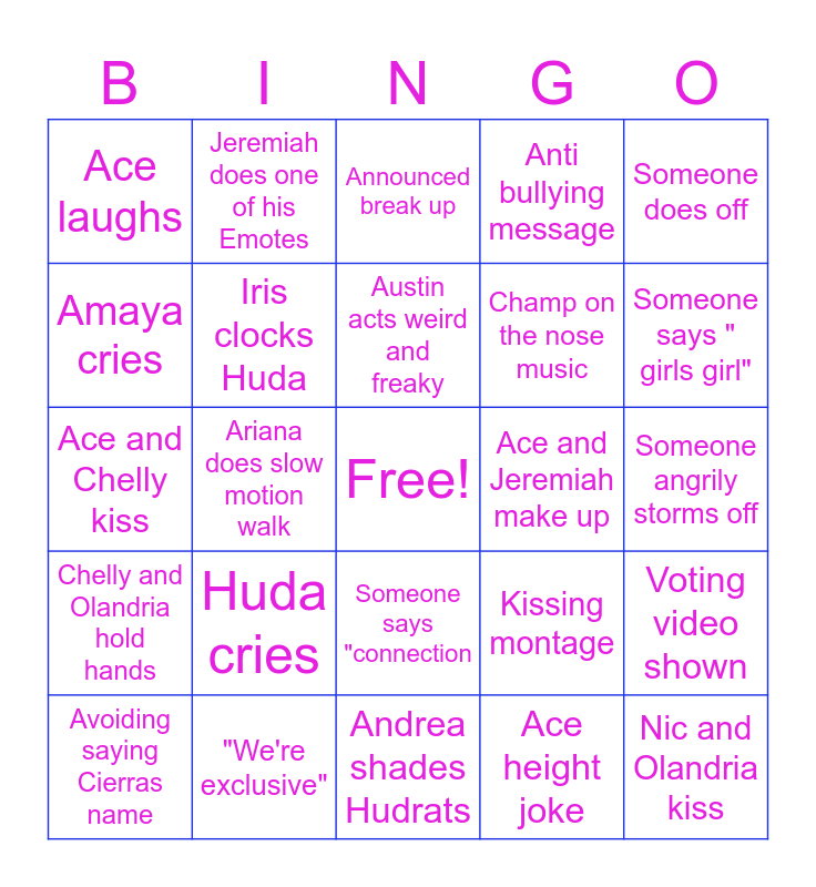 This bingo card has a free space and 24 words: Huda cries, "We're exclusive", Austin acts weird and freaky, Avoiding saying Cierras name, Someone does off, Ace laughs, Amaya cries, Jeremiah does one of his Emotes, Ace and Jeremiah make up, Someone says "connection, Champ on the nose music, Ace and Chelly kiss, Kissing montage, Voting video shown, Iris clocks Huda, Ace height joke, Someone angrily storms off, Announced break up, Someone says " girls girl", Ariana does slow motion walk, Nic and Olandria kiss, Chelly and Olandria hold hands, Anti bullying message and Andrea shades Hudrats.
