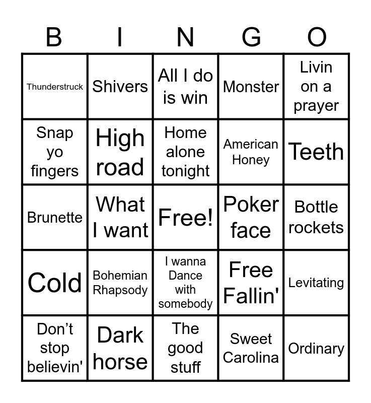 This bingo card has a free space and 42 words: Happen to me, Home alone tonight, Mystical magical, Bohemian Rhapsody, Sweet Carolina, Levitating, Ordinary, Pop music, All I do is win, I wanna Dance with somebody, Bottle rockets, Teeth, What I want, Livin on a prayer, Need you now, Free Fallin', Ladies in the 90’s, Brunette, Say something, Shivers, Snap yo fingers, Drunk, Bad habits, Thunderstruck, Ice ice Baby, Forget tonight, American Honey, Girls just wanna have fun, Let me see ya girl, Friends in low places, Wannabe, Cold, High road, The good stuff, God & Guns N’Roses, Don’t stop believin', Dark horse, Poker face, Miami, Blue strips, Monster and Yeah.