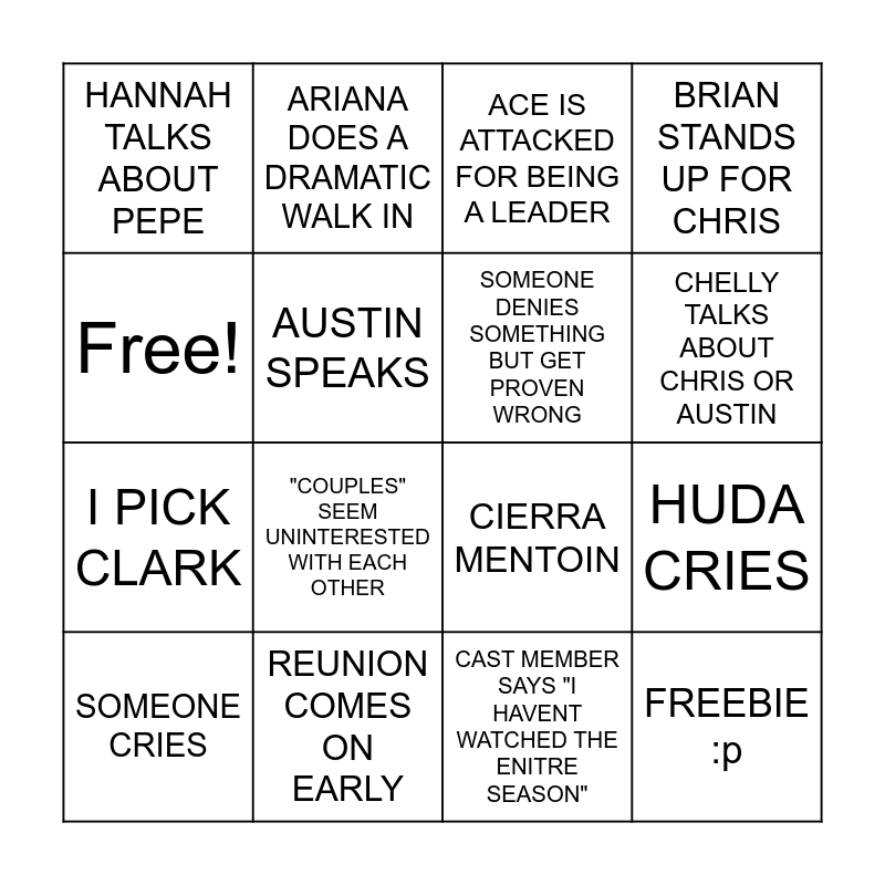 This bingo card has 16 words: REUNION COMES ON EARLY, HUDA CRIES, ACE IS ATTACKED FOR BEING A LEADER, HANNAH TALKS ABOUT PEPE, I PICK CLARK, ARIANA DOES A DRAMATIC WALK IN, CIERRA MENTOIN, CAST MEMBER SAYS "I HAVENT WATCHED THE ENITRE SEASON", Free!, AUSTIN SPEAKS, SOMEONE CRIES, BRIAN STANDS UP FOR CHRIS, "COUPLES" SEEM UNINTERESTED WITH EACH OTHER, CHELLY TALKS ABOUT CHRIS OR AUSTIN, SOMEONE DENIES SOMETHING BUT GET PROVEN WRONG and FREEBIE :p.