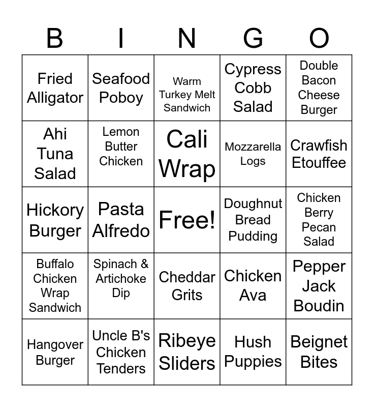 This bingo card has a free space and 24 words: Spinach & Artichoke Dip, Uncle B's Chicken Tenders, Cali Wrap, Hangover Burger, Double Bacon Cheese Burger, Fried Alligator, Ahi Tuna Salad, Seafood Poboy, Doughnut Bread Pudding, Cheddar Grits, Mozzarella Logs, Hickory Burger, Chicken Ava, Pepper Jack Boudin, Lemon Butter Chicken, Hush Puppies, Chicken Berry Pecan Salad, Warm Turkey Melt Sandwich, Crawfish Etouffee, Pasta Alfredo, Beignet Bites, Buffalo Chicken Wrap Sandwich, Cypress Cobb Salad and Ribeye Sliders.