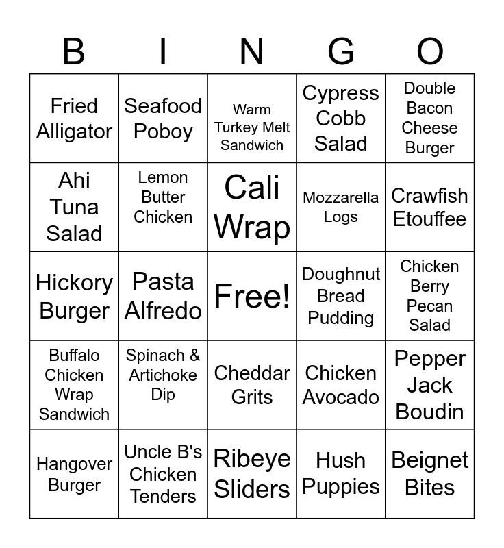 This bingo card has a free space and 24 words: Spinach & Artichoke Dip, Uncle B's Chicken Tenders, Cali Wrap, Hangover Burger, Double Bacon Cheese Burger, Fried Alligator, Ahi Tuna Salad, Seafood Poboy, Doughnut Bread Pudding, Cheddar Grits, Mozzarella Logs, Hickory Burger, Chicken Avocado, Pepper Jack Boudin, Lemon Butter Chicken, Hush Puppies, Chicken Berry Pecan Salad, Warm Turkey Melt Sandwich, Crawfish Etouffee, Pasta Alfredo, Beignet Bites, Buffalo Chicken Wrap Sandwich, Cypress Cobb Salad and Ribeye Sliders.