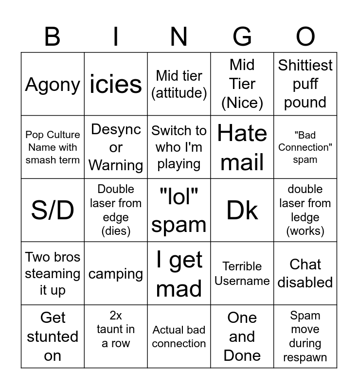 This bingo card has a free space and 24 words: camping, 2x taunt in a row, Switch to who I'm playing, Get stunted on, Shittiest puff pound, Agony, Pop Culture Name with smash term, icies, Dk, I get mad, Hate mail, S/D, Terrible Username, Chat disabled, Desync or Warning, One and Done, double laser from ledge (works), Mid tier (attitude), "Bad Connection" spam, Double laser from edge (dies), Spam move during respawn, Two bros steaming it up, Mid Tier (Nice) and Actual bad connection.