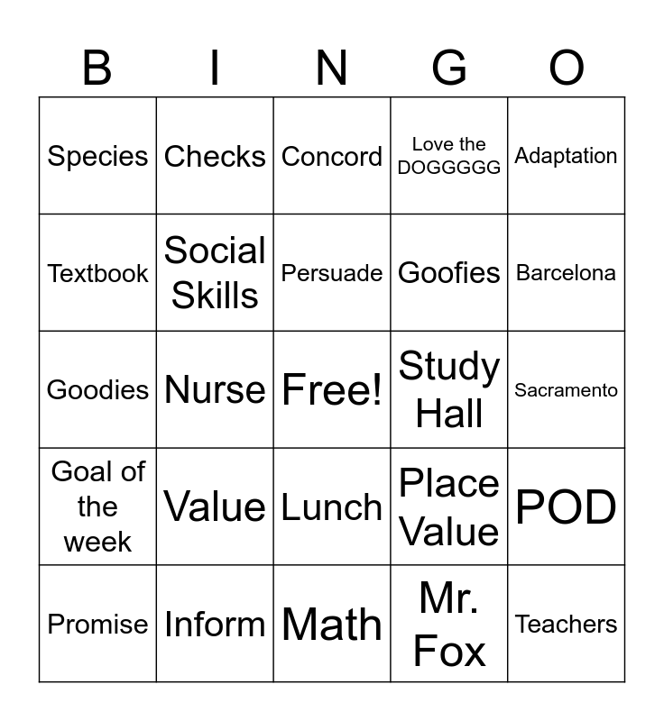 This bingo card has a free space and 24 words: Value, Inform, Persuade, Promise, Adaptation, Species, Textbook, Checks, Study Hall, Lunch, Goofies, Goodies, Place Value, POD, Social Skills, Mr. Fox, Sacramento, Concord, Barcelona, Nurse, Teachers, Goal of the week, Love the DOGGGGG and Math.