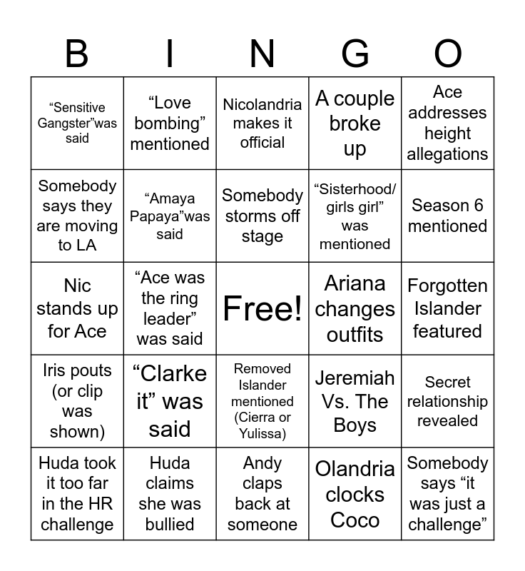 This bingo card has a free space and 24 words: “Clarke it” was said, Huda claims she was bullied, Somebody storms off stage, Huda took it too far in the HR challenge, Ace addresses height allegations, “Sensitive Gangster”was said, Somebody says they are moving to LA, “Love bombing” mentioned, Ariana changes outfits, Removed Islander mentioned (Cierra or Yulissa), “Sisterhood/ girls girl” was mentioned, Nic stands up for Ace, Jeremiah Vs. The Boys, Secret relationship revealed, “Amaya Papaya”was said, Olandria clocks Coco, Forgotten Islander featured, Nicolandria makes it official, Season 6 mentioned, “Ace was the ring leader” was said, Somebody says “it was just a challenge”, Iris pouts (or clip was shown), A couple broke up and Andy claps back at someone.