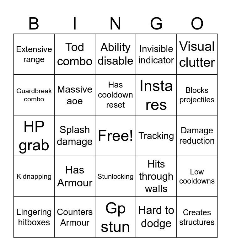 This bingo card has a free space and 24 words: Has Armour, Counters Armour, Has cooldown reset, Lingering hitboxes, Visual clutter, Extensive range, Guardbreak combo, Tod combo, Tracking, Stunlocking, Insta res, HP grab, Hits through walls, Low cooldowns, Massive aoe, Hard to dodge, Damage reduction, Ability disable, Blocks projectiles, Splash damage, Creates structures, Kidnapping, Invisible indicator and Gp stun.
