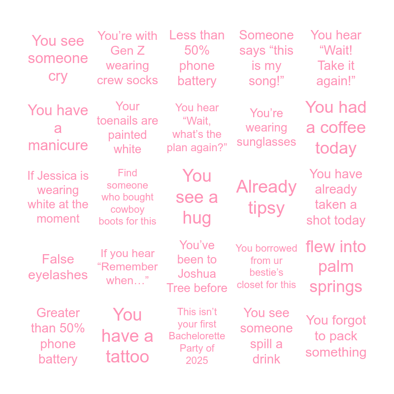 This bingo card has a free space and 59 words: Someone says “I’m too old for this.”, You have a tattoo, You met your SO on a dating app, False eyelashes, You see someone spill a drink, You're older than the bride, Your toenails are painted white, You see someone takes a shot, You’re wearing sunglasses, You’ve known the bride since HS, Someone says “this is my song!”, You see the bride gets emotional, You have a manicure, Took PTO to come celebrate, Posted on social media today, You see someone cry, You forgot to pack something, You hear “Wait! Take it again!”, Someone twerks unprovoked, You hear “Wait, what’s the plan again?”, Already tipsy, Less than 50% phone battery, Greater than 50% phone battery, flew into palm springs, You have more than 5 piercings, You’re younger than bride, Flew into ontario, Your hair is dyed, You had a coffee today, Single and ready to mingle, Flew into LA, You hear “What the helly”, If you have your eyebrows microneedled, You’re a millennial that wears no show socks, You’re with Gen Z wearing crew socks, Packed some Lululemon, Packed some Alo Yoga, Find someone who bought cowboy boots for this, Find someone who has lost or broken a phone this year, If Jessica is wearing white at the moment, If you work remote, If you hear “Remember when…”, You have already taken a shot today, You have vacationed with the bride this year, If you have a hangover kit ready, If you’ve napped today, If you were on the love island bandwagon, If you have a ring on, You’ve been to Joshua Tree before, This isn’t your first Bachelorette Party of 2025, This is your first Bachelorette Party of 2025, You’ve witnessed someone peer pressuring someone else to drink, You’ve had to use ChatGPT today, Find someone with a lower Uber/Lyft rating than yours, You know your big 3 (astrology), You borrowed from ur bestie’s closet for this, Find someone who DEFINITELY overpacked, You’re in your Pilates era and Find someone who owns a Stanley AND an Owala.