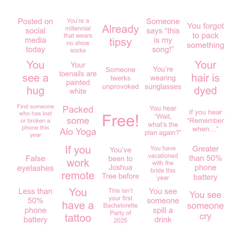 This bingo card has a free space and 60 words: Someone says “I’m too old for this.”, You have a tattoo, You met your SO on a dating app, False eyelashes, You see someone spill a drink, You're older than the bride, Your toenails are painted white, You see someone takes a shot, You’re wearing sunglasses, You’ve known the bride since HS, Someone says “this is my song!”, You see the bride gets emotional, You see a hug, You have a manicure, Took PTO to come celebrate, Posted on social media today, You see someone cry, You forgot to pack something, You hear “Wait! Take it again!”, Someone twerks unprovoked, You hear “Wait, what’s the plan again?”, Already tipsy, Less than 50% phone battery, Greater than 50% phone battery, flew into palm springs, You have more than 5 piercings, You’re younger than bride, Flew into ontario, Your hair is dyed, You had a coffee today, Single and ready to mingle, Flew into LA, You hear “What the helly”, If you have your eyebrows microneedled, You’re a millennial that wears no show socks, You’re with Gen Z wearing crew socks, Packed some Lululemon, Packed some Alo Yoga, Find someone who bought cowboy boots for this, Find someone who has lost or broken a phone this year, If Jessica is wearing white at the moment, If you work remote, If you hear “Remember when…”, You have already taken a shot today, You have vacationed with the bride this year, If you have a hangover kit ready, If you’ve napped today, If you were on the love island bandwagon, If you have a ring on, You’ve been to Joshua Tree before, This isn’t your first Bachelorette Party of 2025, This is your first Bachelorette Party of 2025, You’ve witnessed someone peer pressuring someone else to drink, You’ve had to use ChatGPT today, Find someone with a lower Uber/Lyft rating than yours, You know your big 3 (astrology), You borrowed from ur bestie’s closet for this, Find someone who DEFINITELY overpacked, You’re in your Pilates era and Find someone who owns a Stanley AND an Owala.