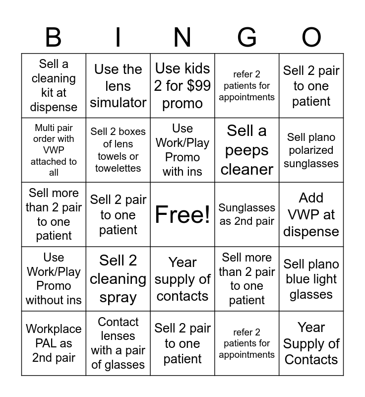 This bingo card has a free space and 24 words: Sell 2 cleaning spray, Contact lenses with a pair of glasses, Use Work/Play Promo with ins, Workplace PAL as 2nd pair, Sell 2 pair to one patient, Sell a cleaning kit at dispense, Multi pair order with VWP attached to all, Use the lens simulator, Sunglasses as 2nd pair, Year supply of contacts, Sell a peeps cleaner, Sell more than 2 pair to one patient, Sell more than 2 pair to one patient, Sell plano blue light glasses, Sell 2 boxes of lens towels or towelettes, refer 2 patients for appointments, Add VWP at dispense, Use kids 2 for $99 promo, Sell plano polarized sunglasses, Sell 2 pair to one patient, Year Supply of Contacts, Use Work/Play Promo without ins, refer 2 patients for appointments and Sell 2 pair to one patient.