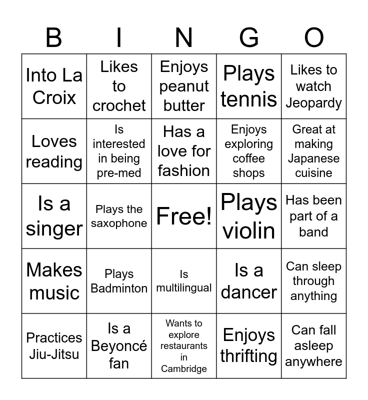 This bingo card has a free space and 24 words: Plays Badminton, Is a Beyoncé fan, Has a love for fashion, Practices Jiu-Jitsu, Likes to watch Jeopardy, Into La Croix, Loves reading, Likes to crochet, Plays violin, Is multilingual, Enjoys exploring coffee shops, Is a singer, Is a dancer, Can sleep through anything, Is interested in being pre-med, Enjoys thrifting, Has been part of a band, Enjoys peanut butter, Great at making Japanese cuisine, Plays the saxophone, Can fall asleep anywhere, Makes music, Plays tennis and Wants to explore restaurants in Cambridge.
