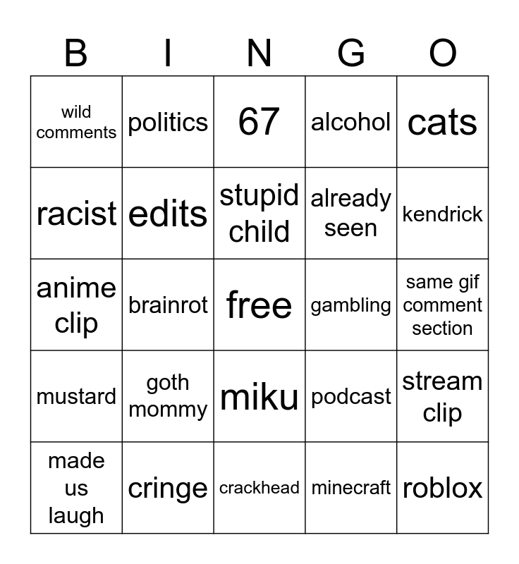 This bingo card has a free space and 24 words: goth mommy, cringe, stupid child, made us laugh, cats, wild comments, racist, politics, gambling, miku, already seen, anime clip, podcast, stream clip, edits, minecraft, same gif comment section, 67, kendrick, brainrot, roblox, mustard, alcohol and crackhead.