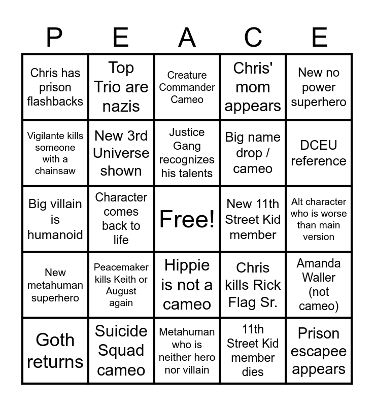 This bingo card has a free space and 24 words: Peacemaker kills Keith or August again, Suicide Squad cameo, Justice Gang recognizes his talents, Goth returns, New no power superhero, Chris has prison flashbacks, Vigilante kills someone with a chainsaw, Top Trio are nazis, New 11th Street Kid member, Hippie is not a cameo, Big name drop / cameo, Big villain is humanoid, Chris kills Rick Flag Sr., Amanda Waller (not cameo), New 3rd Universe shown, 11th Street Kid member dies, Alt character who is worse than main version, Creature Commander Cameo, DCEU reference, Character comes back to life, Prison escapee appears, New metahuman superhero, Chris' mom appears and Metahuman who is neither hero nor villain.