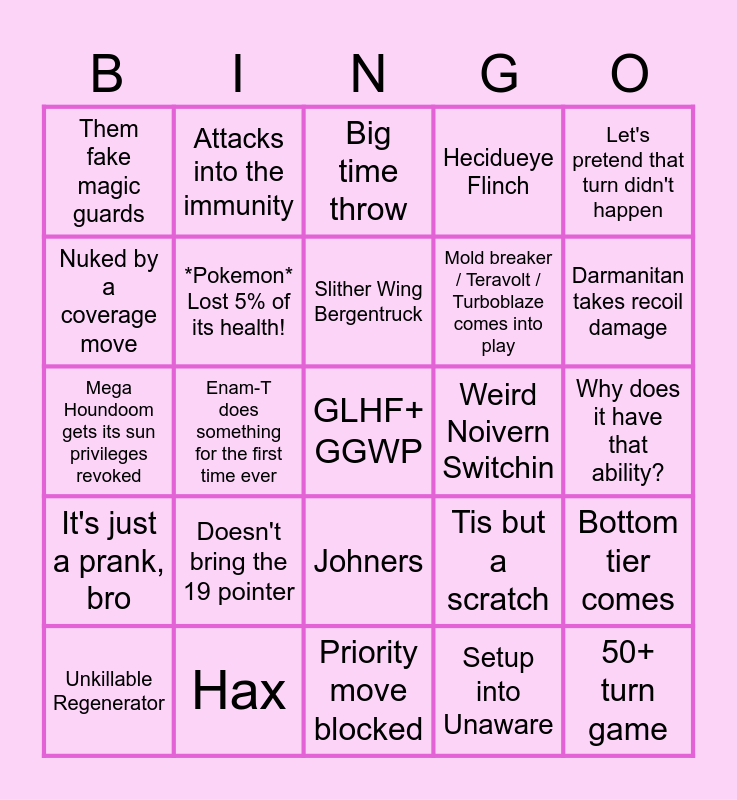 This bingo card has a free space and 24 words: Doesn't bring the 19 pointer, Hax, Slither Wing Bergentruck, Unkillable Regenerator, Let's pretend that turn didn't happen, Them fake magic guards, Nuked by a coverage move, Attacks into the immunity, Weird Noivern Switchin, Johners, Mold breaker / Teravolt / Turboblaze comes into play, Mega Houndoom gets its sun privileges revoked, Tis but a scratch, Bottom tier comes, *Pokemon* Lost 5% of its health!, Setup into Unaware, Why does it have that ability?, Big time throw, Darmanitan takes recoil damage, Enam-T does something for the first time ever, 50+ turn game, It's just a prank, bro, Hecidueye Flinch and Priority move blocked.